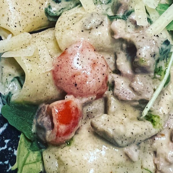Tagliatelle de huevo con mantequilla, parmesano, rucula, setas y salsa trufada
