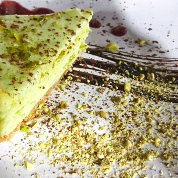 Tarta de galletas con crema al chocolate blanco, variada con pistacho y queso mascarpone