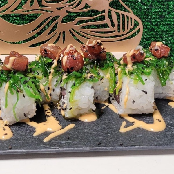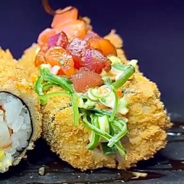 • Roll maki tokio: arroz con queso crema, surimi crujiente, aguacate, pepino y cebollino con salsa spicy (8 unidades)