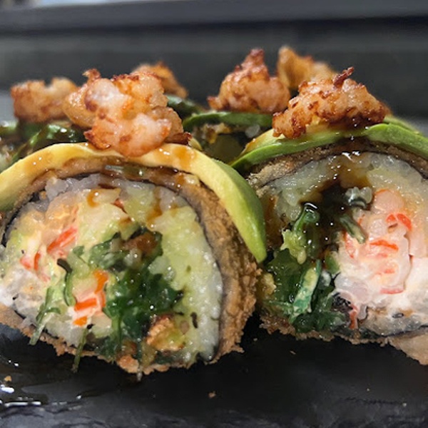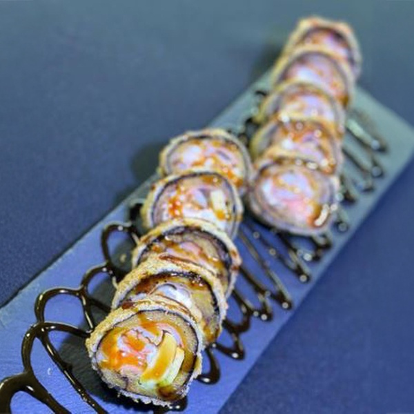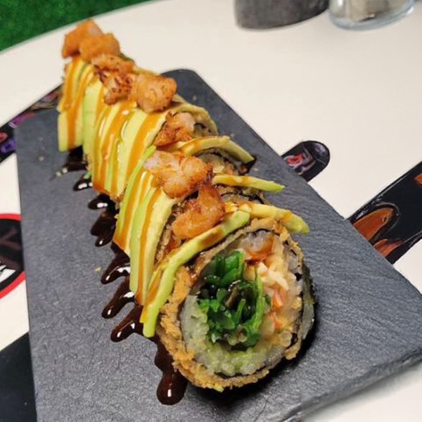 • Han roll tempura: arroz, con queso crema, langostinos crujientes, aguacate, pasta dinamita y salsa fuji (10 unidades)
