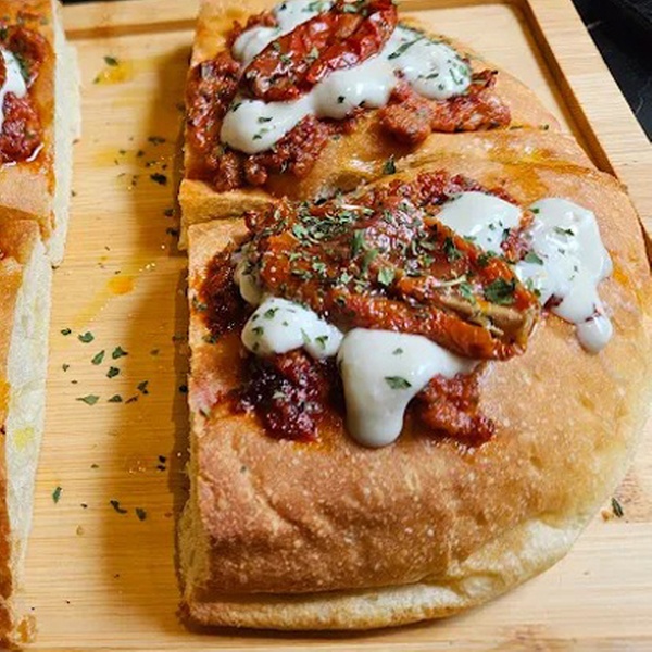 - Focaccia con cebolla caramelizada, asiago DOP y nueces: focaccia esponjosa con cebolla caramelizada, queso Asiago DOP fundido y crujientes nueces desmenuzadas. Sabor equilibrado entre dulce y salado