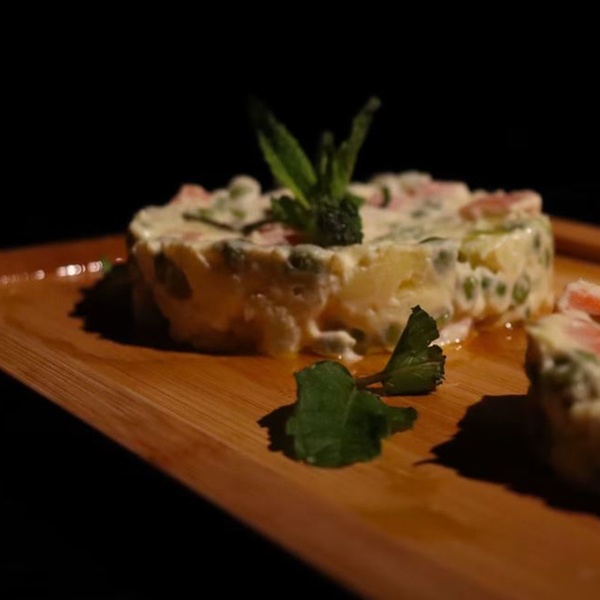 - Ensalada rusa: ensalada cremosa con papas, zanahorias, guisantes y mayonesa artesanal, a menudo con huevo y atún o pollo. Clásico entrante frío y sabroso