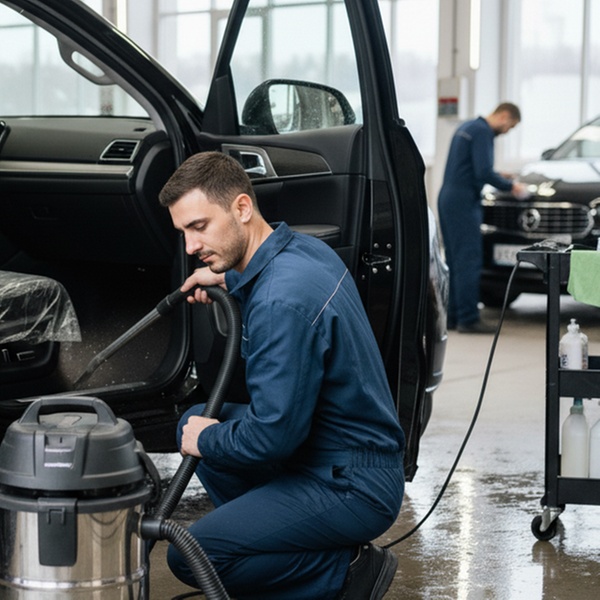- Aspirado profundo: se aspiran suelo, alfombrillas, asientos y maletero, llegando a ranuras y zonas de difícil acceso (a veces con aire comprimido).