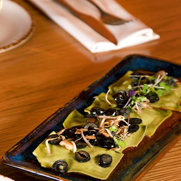 - Raviolis de vegetales braseados con sofrito de tomate casero, aceitunas negras, brotes de soja y albahaca