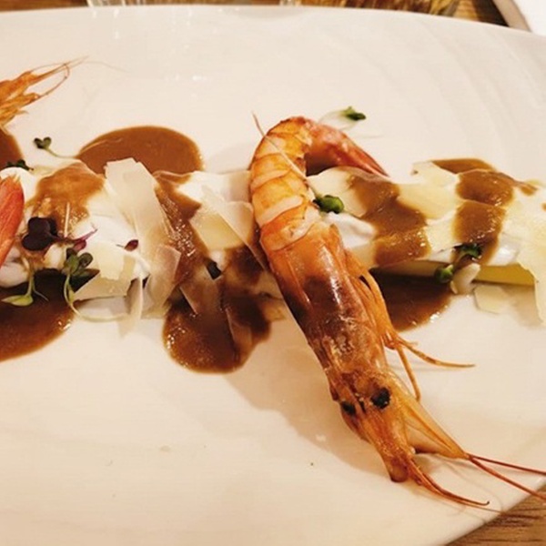 - Croquetas de gamba al ajillo con emulsión de crustáceos