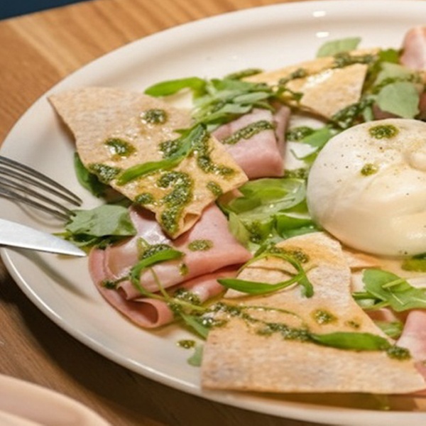 - Burrata cremosa con mortadela italiana, pesto de albahaca y pan crujiente