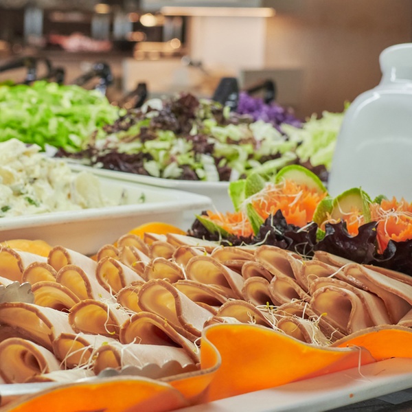 El almuerzo buffet ofrece una variada selección de platos frescos preparados al momento, que incluyen ensaladas, pastas, embutidos, quesos, arroces, carnes y pescados, acompañados de diversas guarniciones.