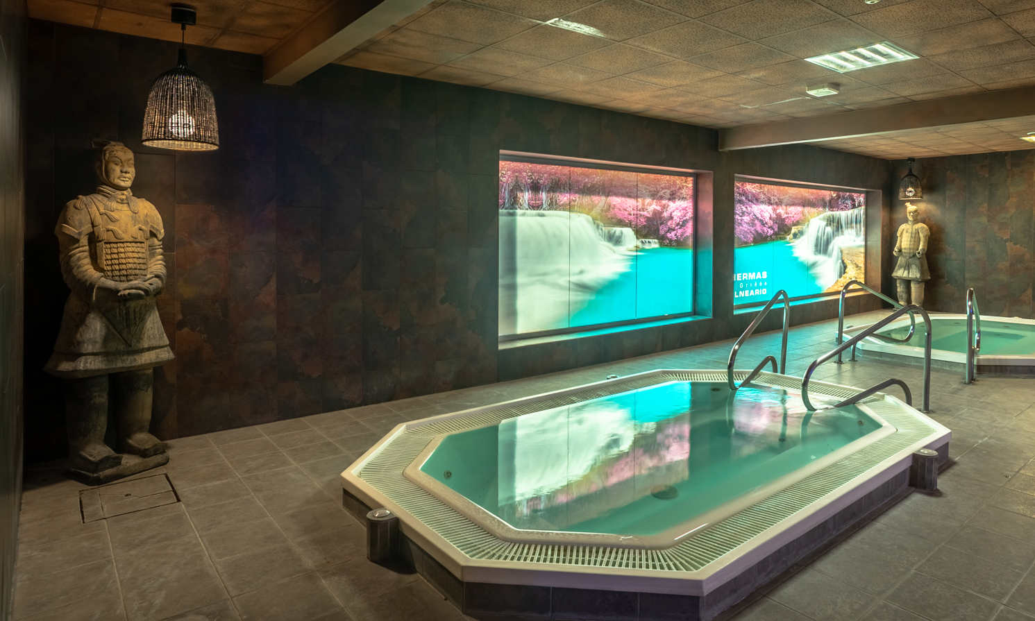 - Gran piscina central: temperatura entre 35-37 °C, con casi 100 chorros que masajean desde los tobillos hasta las cervicales. Es el elemento principal del balneario y parte esencial del circuito termal.