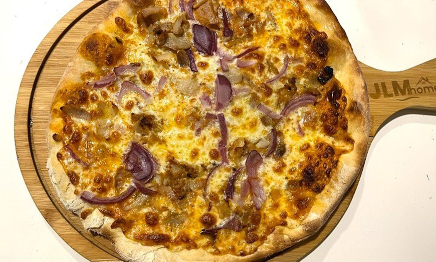 - Calzone bacon y jamón: salsa de tomate, mozzarella, bacon y jamón