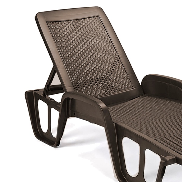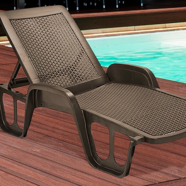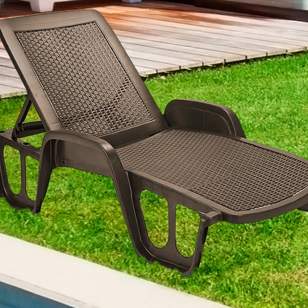 Esta tumbona plegable de resina con efecto ratán, tiene varias posiciones y está diseñada para el exterior