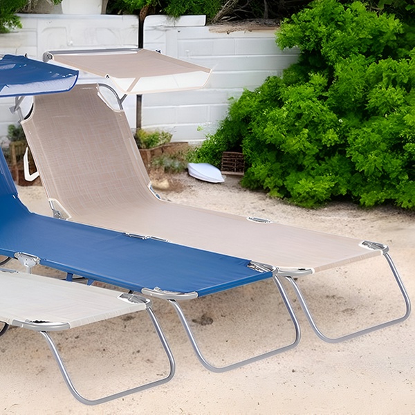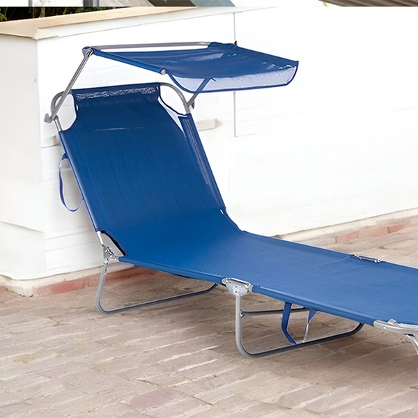 Esta tumbona plegable cuenta con un parasol integrado, ideal para disfrutar del sol con estilo y comodidad en cualquier aventura al aire libre