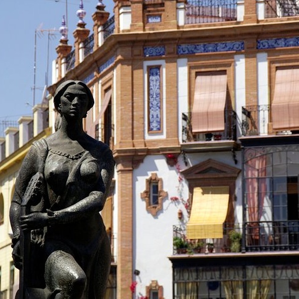 Entrada principal a Triana, presidida por esculturas emblemáticas y rodeada de edificios históricos y bares con encanto.