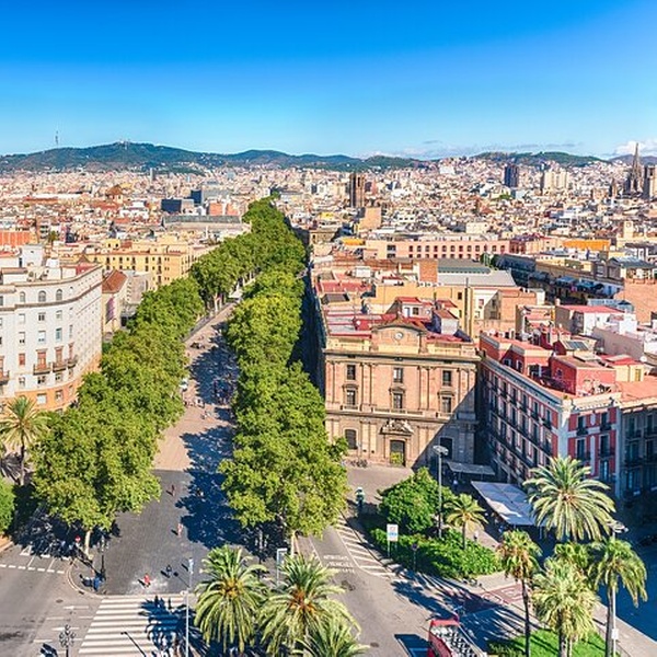 La avenida más famosa de la ciudad, llena de vida, artistas callejeros, quioscos de flores y cafeterías, que conecta Plaza Cataluña con el puerto.