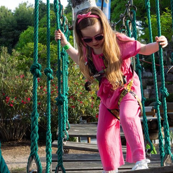 "Highlights - Recorrido de puentes y tirolinas - Circuito de 14 camas elásticas - Situado en el centro de Salou - Complementa tu jornada con una partida de Minigolf o Tiro con arco - A partir de 3 años "
