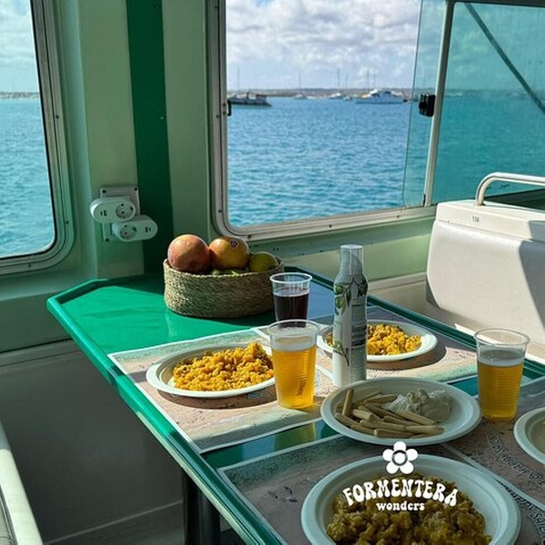 Nuestra primera parada te llevará a la paradisíaca isla de s’Espalmador, donde el catamarán se detiene sobre un mar tan transparente que parece irreal. Durante más de una hora podrás lanzarte al agua, descubrir la vida marina haciendo snorkel, deslizarte por el tobogán acuático, relajarte sobre flotadores o disfrutar del paddle surf en un entorno que invita a desconectar de todo. Mientras el paisaje te envuelve, a bordo te espera una paella recién elaborada —también disponible en versión vegetariana y vegana— para saborear el Mediterráneo en su máxima expresión. Una experiencia que combina aventura, sabor y la magia natural de Formentera.