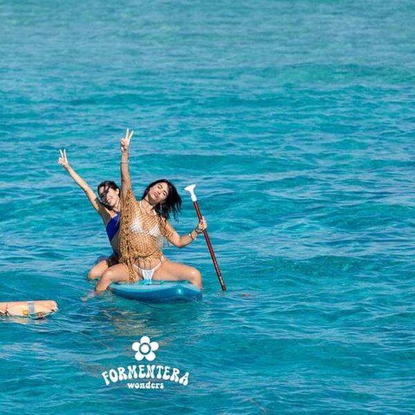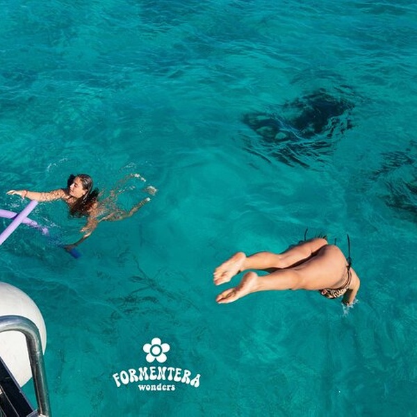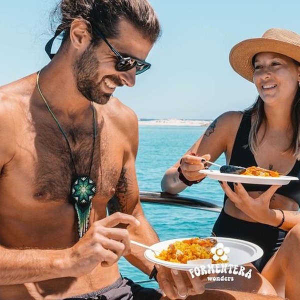 El catamarán fondea en s’Espalmador (Pas des Trucadors) durante unas 2 horas, un auténtico paraíso de arena blanca y aguas turquesas reconocido entre los lugares más bellos del Mediterráneo. Aquí los pasajeros disfrutan de la comida a bordo, con paella ibicenca (disponible opción vegetariana o vegana) y de los deportes acuáticos, como paddleboard, snorkel o flotadores.