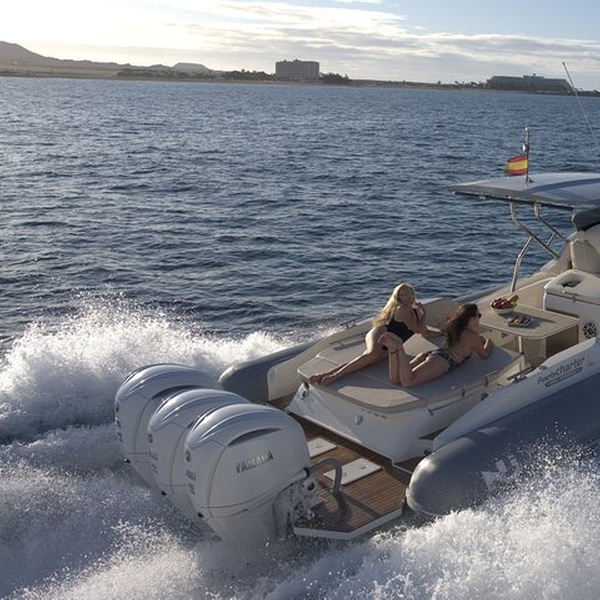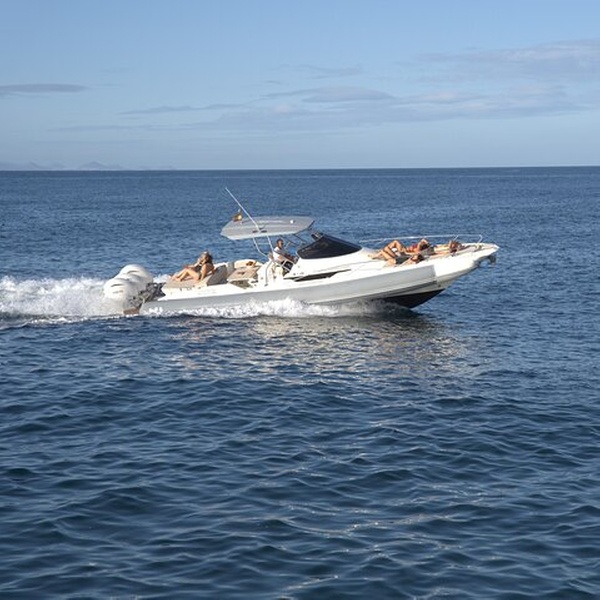 Descubre el Parque Natural de la Isla de Lobos a bordo de nuestra elegante semirrígida Prince 38 Sport Cabin, una embarcación de 11 metros equipada con 3 motores Yamaha de 300 CV, que combina potencia, confort y máxima seguridad.