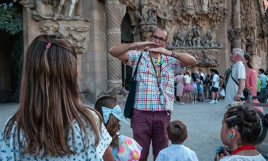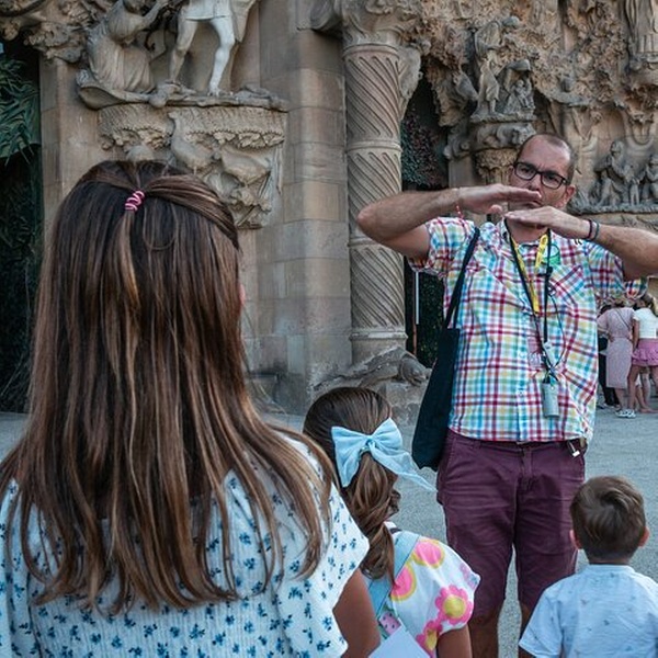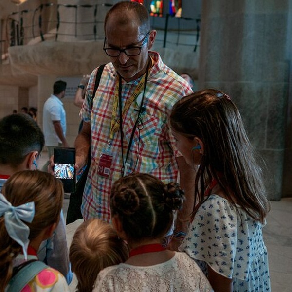Comience en la Fachada de la Natividad, donde los niños se convierten en exploradores, divisando animales ocultos en la piedra : una tortuga, un pavo, una paloma, y tal vez incluso un león. Los padres aprenderán cómo Gaudí llenó su obra de símbolos inspirados en la naturaleza, mientras los niños se sumergen en la diversión del descubrimiento. Una vez dentro, la basílica se convierte en un parque infantil de luz y color. La luz del sol fluye a través de las vidrieras en cada tono del arco iris, y las familias están invitadas a ver cuántos colores diferentes pueden encontrar en el piso. Entonces es hora de mirar hacia arriba en el bosque mágico de Gaudí. Los niños deben contar cuántas de estas columnas de árboles tocan el suelo. Mientras tanto, los padres adquieren una comprensión más profunda de la visión de Gaudí y cómo diseñó la luz y el espacio para crear una sensación de armonía y asombro. El viaje continúa en la Fachada de la Pasión, donde los niños buscan soldados esculpidos en la piedra. Mientras los niños completan su desafío, los padres aprenden sobre las escenas dramáticas grabadas en la piedra.