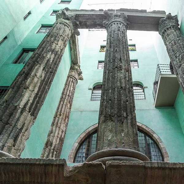 Restos arqueológicos del antiguo Templo Romano de Augusto, escondidos dentro del Barrio Gótico.