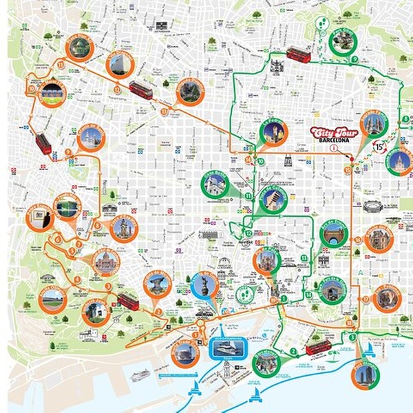 Ruta Oeste (naranja): World Trade Center (WTC), Jardins de Miramar, Fundació Joan Miró, Anella Olímpica, Museu Nacional d’Art de Catalunya (MNAC), Poble Espanyol, Caixafòrum – Pavelló Mies van der Rohe, Plaça d’Espanya, Estació de Sants, Camp Nou - Museu FC Barcelona, Plaça Pius XII, L’Illa Diagonal, Avinguda Diagonal, La Pedrera, Sagrada Familia, Estació del Nord, Zoo – Poblenou, Port Olímpic, Pla de Palau, Passeig de Colom Ruta Este (verde): Pla de Palau, Barceloneta, Port Olímpic, Platja del Bogatell, Nova Mar Bella, Fòrum, Torre Glòries, Recinte Modernista de Sant Pau, Park Güell, La Pedrera, Casa Batlló, Plaça Catalunya, Arc de Triomf, El Born – Parc de la Ciutadella