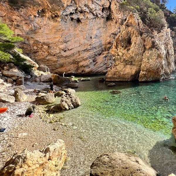 Ubicación en la cala Granadella, Jávea. Punto de encuentro en su varadero, el cual se encuentra al final de la cala, donde estaremos esperándote con nuestros kayaks blancos, verdes y azules.