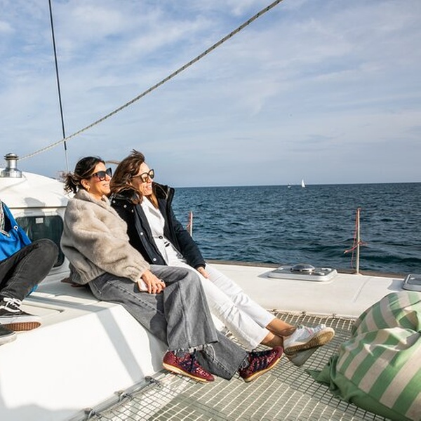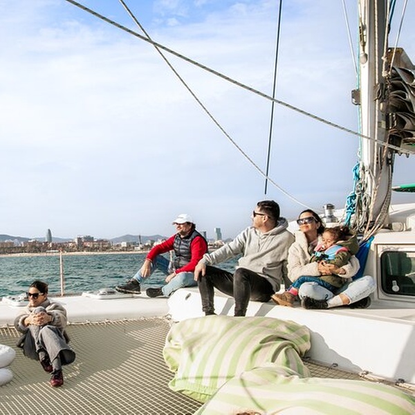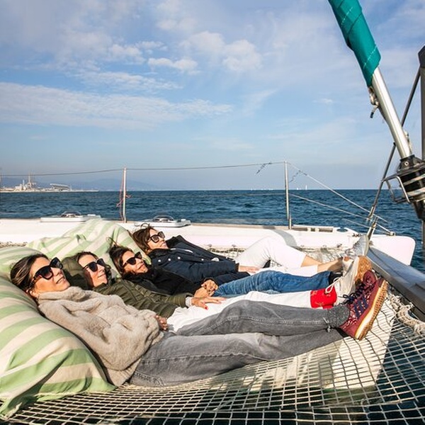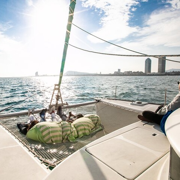 Continúa navegando por la costa de Barcelona, descubriendo las encantadoras playas de los barrios marineros tradicionales de la ciudad. Disfruta del impresionante horizonte con monumentos emblemáticos como la Sagrada Familia, la Catedral de Barcelona y el impresionante W Hotel. Acuéstate en la cómoda red de catamaranes, sumérgete en la tranquilidad del mar Mediterráneo y relájate, o date un baño refrescante si el clima lo permite.