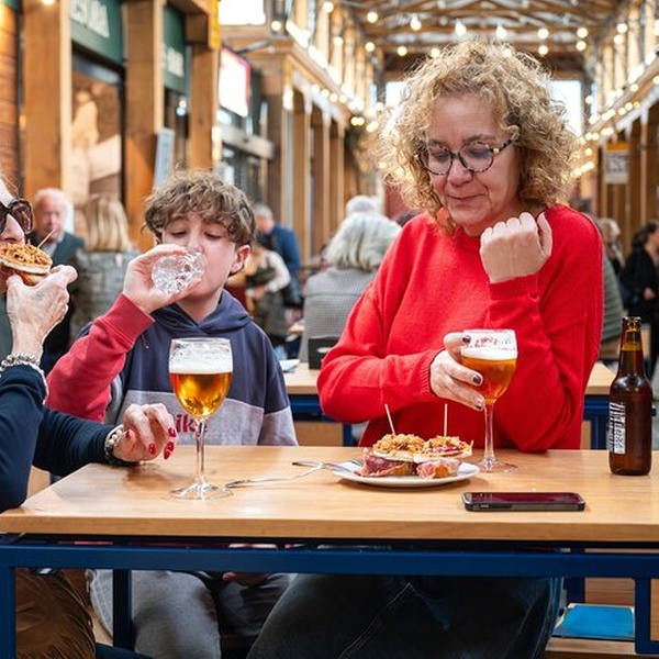 Pasea por los puestos del mercado, elige tapas de diferentes rincones de España y refresca con cerveza valenciana. Esta es la vida cotidiana a todo sabor.