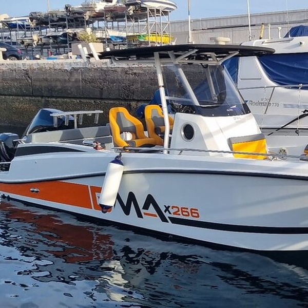 Bma X266 Fishing,Un diseño innovador, nacido en Italia, el país símbolo internacional del estilo y sede de la máxima expresión de una capacidad y calidad artesanal única, que se funde bien con la milenaria tradición náutica universalmente reconocida. Equipado con motor fuera de borda Mercury 300Cv + un motor Mercury 20Cv para Remolque/Emergencia. Barco rápido, con Wc eléctrico, con muy cómodo solárium, indicado para la pesca o para las excursiones. Situada en el hermoso puerto de Marina San Miguel en Golf del Sur en Tenerife; podrás elegir si quieres visitar las playas y calas de Tenerife Sur o intentar pescar en el Océano Atlántico.