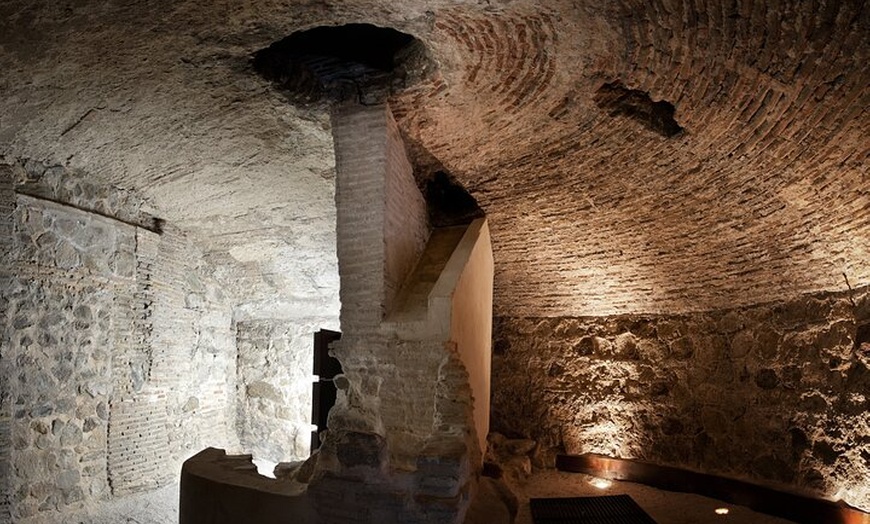 Visitamos -el guía abre con su llave-, en privado, el parte de las termas romanas imperiales de Toledo (no son las oficinas públicas de las termas que todos visitan), un magnífico subterráneo con siglos de historia. Aviso importante: desde el 1 de julio de 2025 no se visitará Thermae, en su lugar accederemos a otra ubicación privada de las mismas termas romanas, también insólita y curiosa. ¡Pronto más novedades en esta ruta!