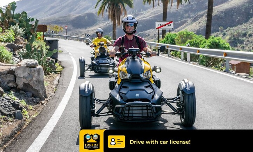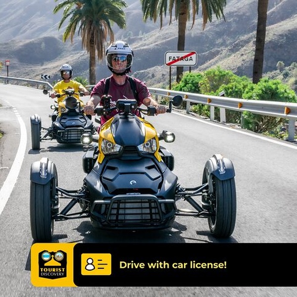Se necesita licencia de auto. Reservas para 2 o más adultos significa que compartirá los vehículos. Puede comprar más vehículo con nosotros. Comience su aventura con una breve introducción y papeleo en nuestra oficina / garaje. Después de una explicación de cómo manejar a los Can-Am Rykers, te atarás los cascos y saldrás a la carretera de Maspalomas a la encantadora ciudad de Fataga. Mientras conduces tu moto Ryker, quedarás cautivado por el impresionante paisaje de montaña. Las carreteras con curvas hacen un paseo agradable, ofreciendo vistas impresionantes. En Fataga, dar un paseo tranquilo para admirar sus hermosas casas. Nuestro viaje de regreso a Maspalomas incluye una parada en el panorámico "Mirador Astronómico de la Degollada de las Yeguas". Aquí, disfrutarás de impresionantes vistas de casi todas las Maspalomas. Únete a nosotros para una inolvidable visita guiada en moto que combina aventura y belleza natural. Tanto si eres un entusiasta de la moto como si buscas una excursión única para descubrir Gran Canaria de una manera única.