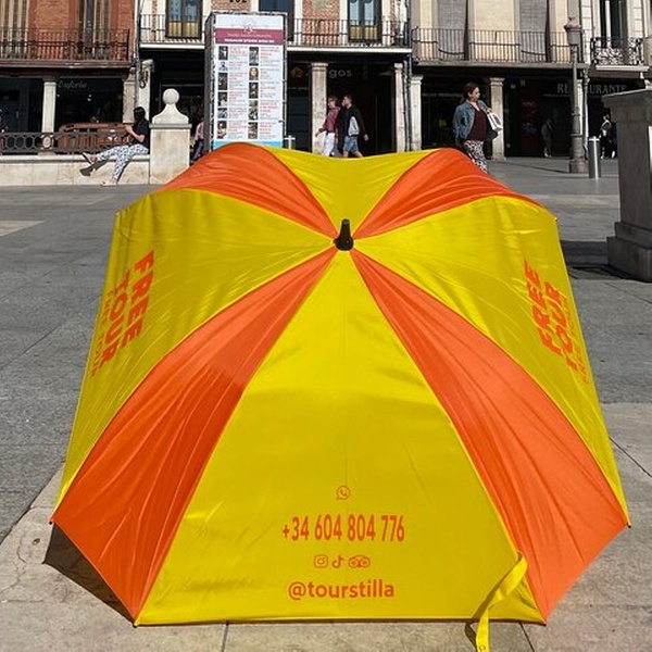 - Ubicado en el centro de la Plaza. Busca el paraguas bicolor AMARILLO Y NARANJA.