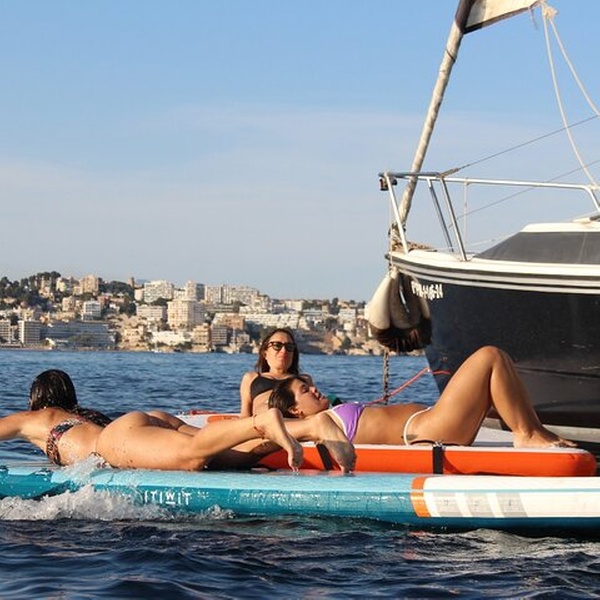 Excursión Privada Exclusiva, Es una Aventura Divertida y Emotiva a la vez. Entrará por sus ojos y quedará por siempre en su corazón!! El mejor Recuerdo de Mallorca!! Navegaremos saliendo desde el Club de Mar, recorriendo la imponente arquitectura Gotica Medieval de su Catedral y Antiguas Murallas, que se mezclan con los edificios de diseño Contemporaneo de la costa de Palma. Una vez fuera del puerto, recorreremos hermosas Calas y Playas, como Cala Mayor, Calanova, Illetas, Cala Comtesa, Cala Xinxell... luego fondearemos en la playa de Puerto Portals y disfrutaremos de las Plataformas Gigantes, PadleSurfs, Kayaks, Snorkel, y nadaremos hasta el anochecer en sus calidas y cristalinas aguas. Disfrutaremos de la majestuosidad de la Puesta de Sol y el cambio de tonalidades del Cielo. Finalmente pasearemos de regreso al anochecer, guiados por las Estrellas y la Luna, disfrutando de las vistas nocturnas de la ciudad y de la brisa mediterranea de Mallorca.