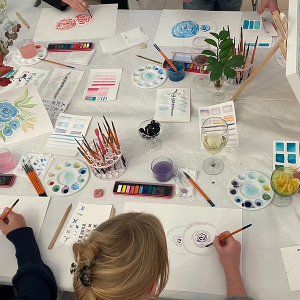 Pinta con acuarelas rodeado de arte y vino ilimitado mientras aprende técnicas básicas y explora la creatividad