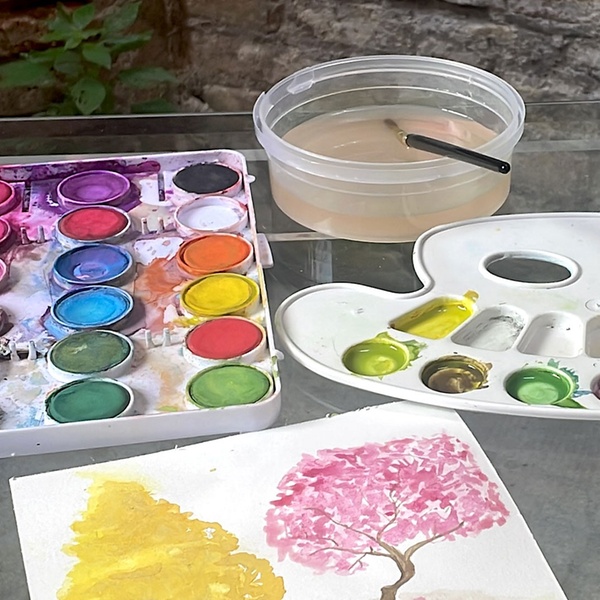 Además, todo el material necesario está incluido: colores de acuarela, papeles, pinceles, lápiz, borrador..., incluido un sobre de cartón tamaño A3 para llevar a salvo tu obra de arte a casa. Por tu ropa no tienes que preocuparte demasiado, también tendrás un delantal de algodón para protegerla durante el taller.
