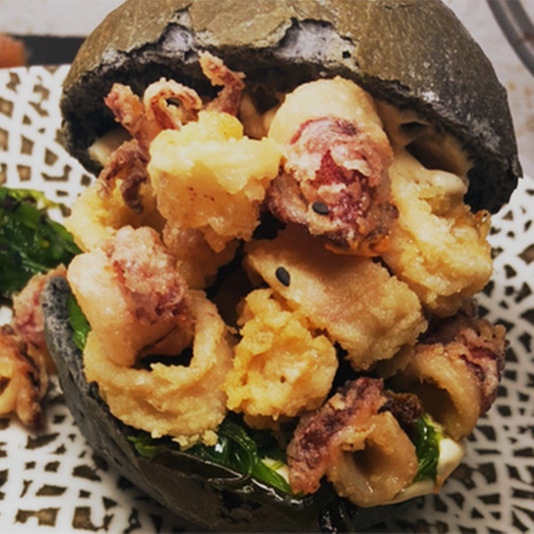 • Brioche de calamar con mayo trufa y lima (2 unidades)