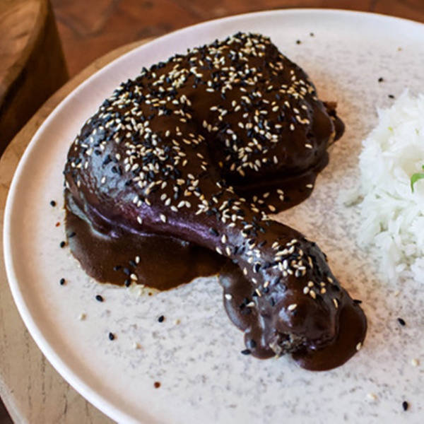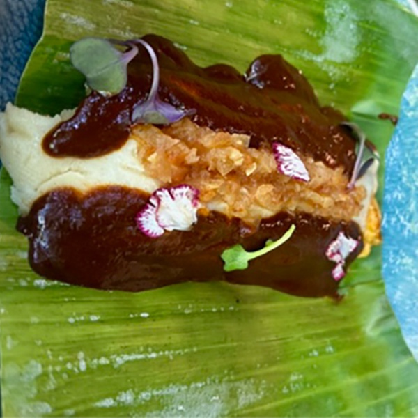 • Tamal 105, queso y rajas con sofrito gobernador y mole rojo