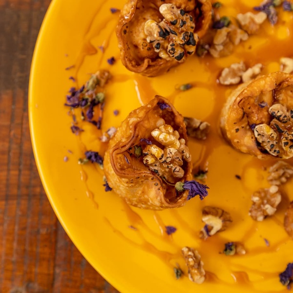 Gourmet de pollo: queso rulo, cebolla caramelizada, pollo