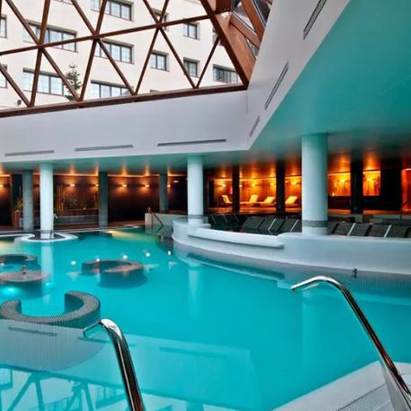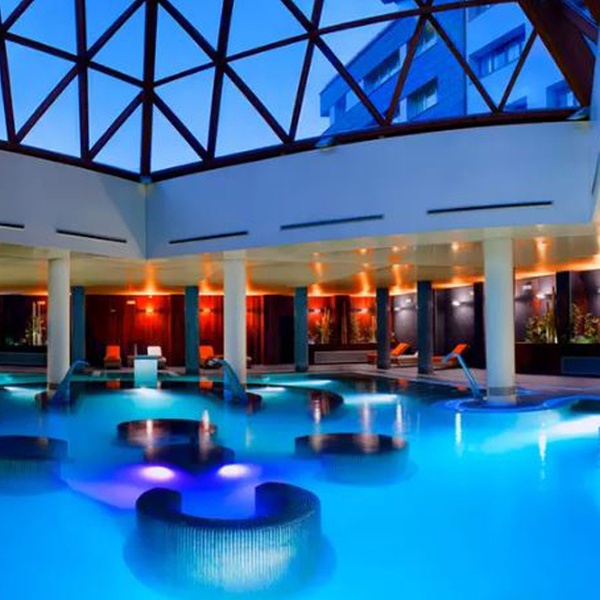 Características del spa: descubrir la piscina con jets a diferentes alturas, tumbonas de hidromasaje, y cascadas. Este spa ofrece un ambiente con duchas de sensaciones, sauna finlandesa y más