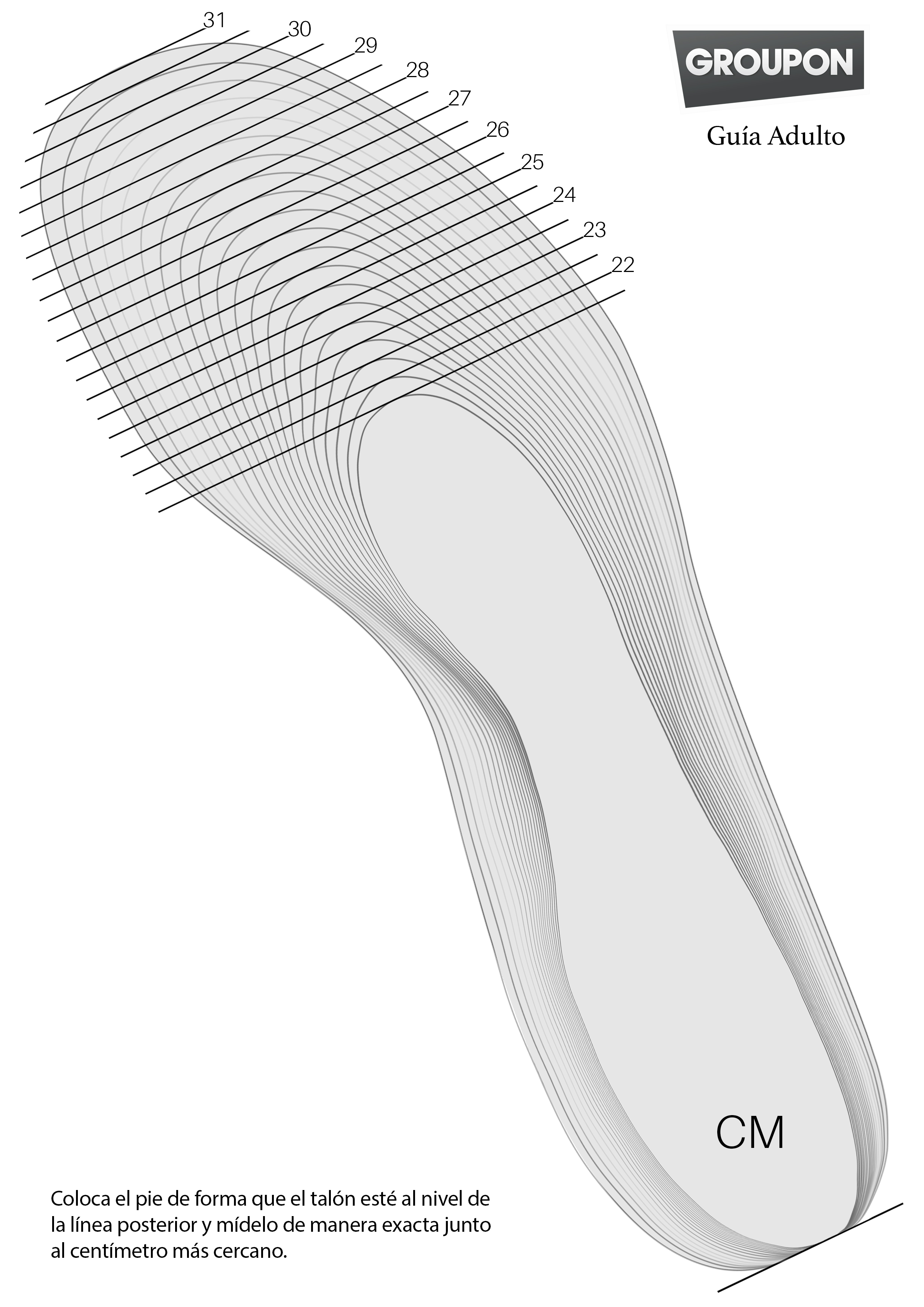 Cada zapato es diferente. En Groupon lo sabemos y, por eso, nos esforzamos para proporcionarte la mejor información posible antes de que realices tu compra. En la mayoría de las ofertas de calzado, te mostraremos la talla del zapato en numeración UK y UE y su equivalencia en centímetros. Antes de realizar cualquier compra, te recomendamos estudiar detenidamente los tamaños e identificar el que mejor se adapta a tu pie.