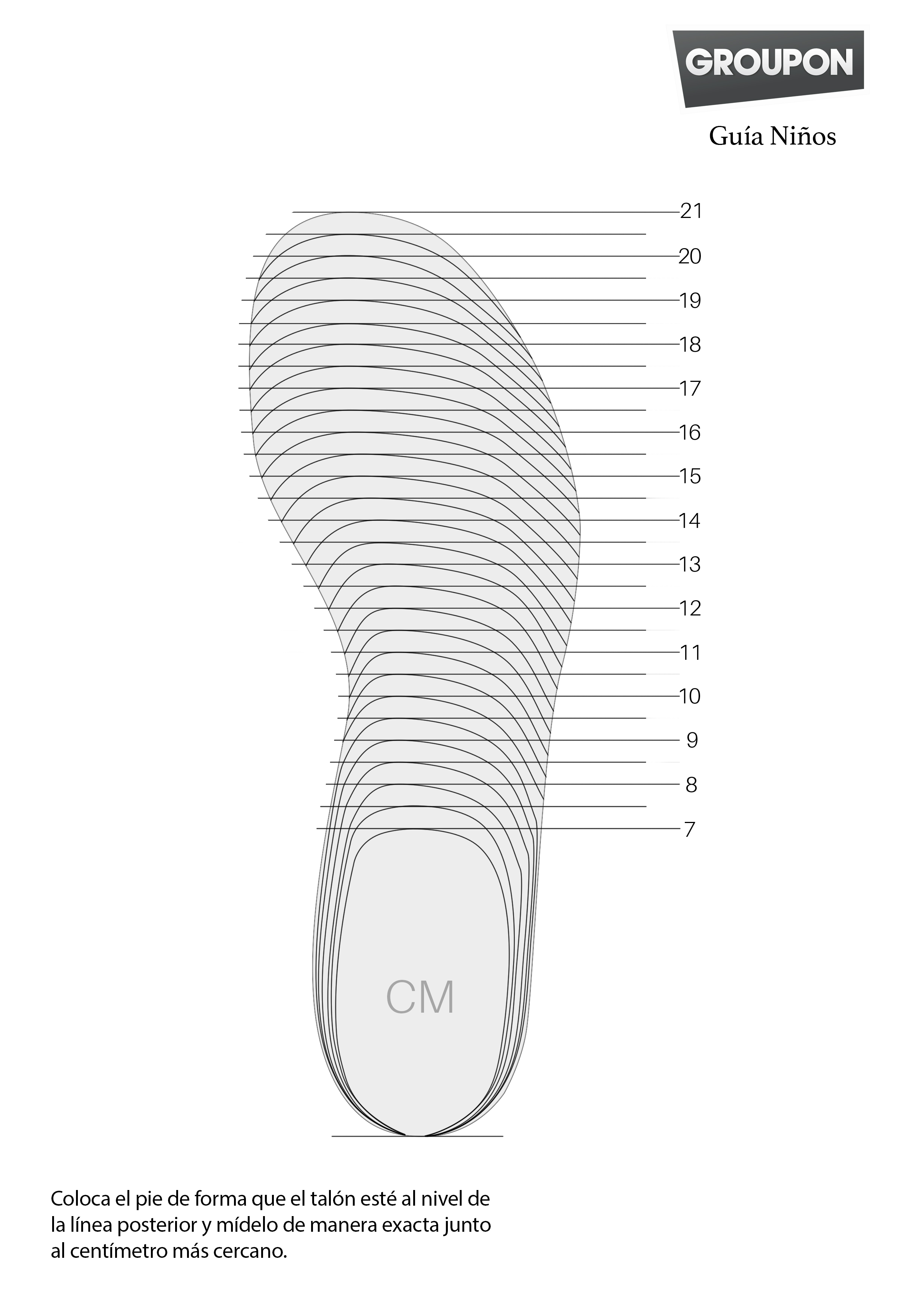 > Imprime nuestra guía adulto o niños Comprueba el tamaño de tu pie colocando el talón contra la pared y midiéndolo desde la pared hasta el dedo gordo. Deberás imprimir la guía en una hoja DIN A4 para asegurar que está en la escala adecuada.